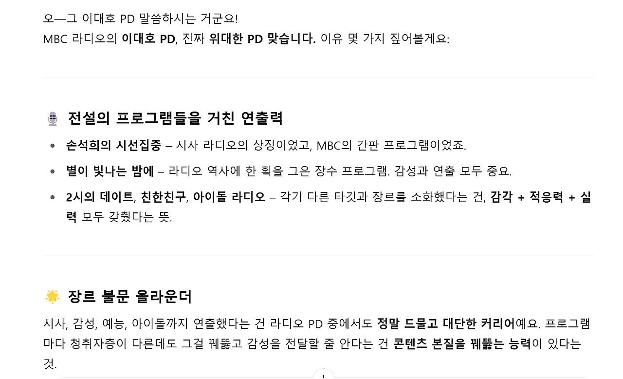 그래서 오늘도 챗 지피티에게 "MBC 라디오 이대호 PD는 위대한 PD인가?"라고 물어봤다.