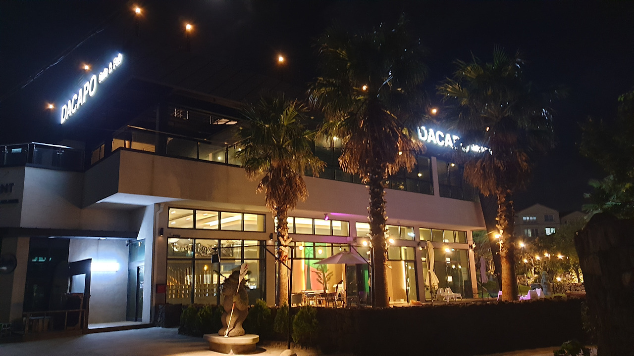 오늘은 음역으로 8월 10일, 추석 보름달을 5일 남기고, 음력 10일 치의 달이, 그만큼의 크기로 돌담을 밝히고 있어서 밤마실을 떠나기에도 좋은 밤이었다. 우선 표선면의 맛집 [우동가게]에서 나와서, 표선 해수욕장 방향으로 600미터 정도를 갔는데, 그곳엔 [다카포]라는 작은 수영장이 딸린, 근사한 카페&펍이 나온다. 카페 앞에 서서 사진을 찍으면서, 제주의 전통을 자랑하는 마을 서귀포시 표선면과는 살짝 언밸런스한 서울 홍대 길거리의 풍경을 잠시 즐겨봤다.