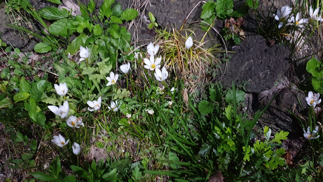 추석 보름달을 5일 앞둔 제주의 밤하늘 아래에서는, 돌담에 기대어 [흰꽃 나도 샤프란]도 커가고 있었다. 달빛이 비치자, 하얀 꽃잎이 더욱 예쁘게 반짝였다.