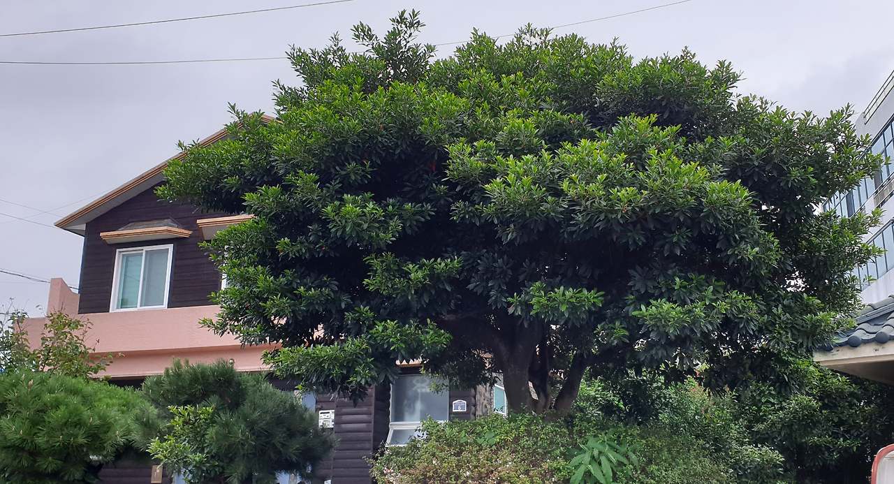 <제주도 서귀포시 표선면의 민가 돌담 옆에서, 흔히 볼 수 있는 나무 담팔수. 우리나라에서는 제주도에서만 담팔수가 자란다. >