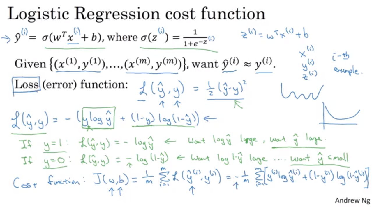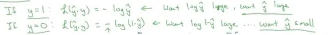 L(y^,y)=-(y*logy^ + (1-y)*log(1-y^))가 Logistic Regression에서 가지는 수학적 의미는 이렇다. Logistic Regression은 Binary Classification을 구현하기 위한 알고리즘이므로, 아웃풋 y가 가질 수 있는 값은 0 아니면 1 둘 중의 하나이다. 따라서 y=1일 때, 그리고 y=0일 때로 나누어서 계산을 하면,