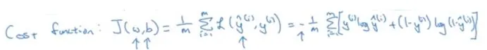 그리고 가장 마지막에 정의한 Cost Function은 아래와 같다. Loss 함수 하나하나가 1번째, 2번째,,, m번째 트레이닝 데이터 셋 마다 계산이 되는데 이들의 총합을 의미한다. 아래 수식에서 y옆에 붙은 (i) 첨자는 i번째 데이터 셋을 의미한다. 일반적인 표기법으로 m번째 데이터셋이 있다고 표현하므로, i=1에서 m까지로 해서 시그마 기호를 사용하여 아래와 같이 수학적으로 Cost Function을 정의할 수 있다.