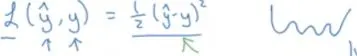 여기서부터가 조금 골 때리는 내용일 수 있기는 한데, 끈기 있게 한번 들여다보도록 하자. 우리가 아주 쉽게 생각할 수 있는 y^와 y의 Loss(error)를 나타내는 수학적 표기로는 둘의 차의 제곱을 반으로 나눈 정도가 있을 것이다. 그런데 실제로는 Logistic Regression에서 이와 같은 함수는 잘 쓰이지 않는데, 그 이유는 이 함수를 가지고 gradient descent를 사용하여 최적 값을 찾아갈 때, 아래 수식 옆에 꼬불꼬불한 그래프처럼, 군데군데의 local optima를 극복하지 못할 가능성이 크기 때문이다. 이에 대해서는 잘 이해가 안된다 하더라도 그냥 그런가 보다 하고 넘어가고, 다른 글에서 더 자세히 다룰 예정이다.