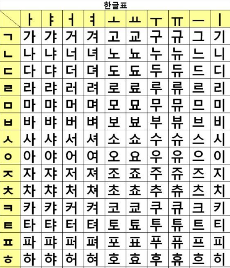 한글표를 보고 한 번씩 소리 내어 읽습니다.
