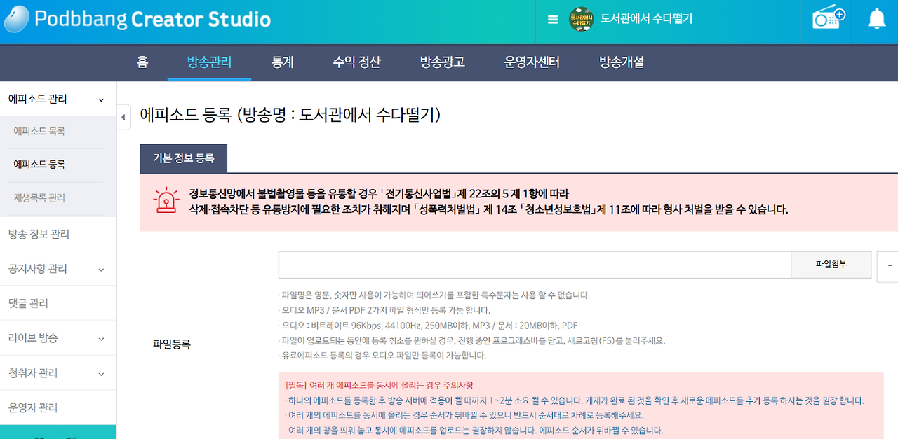 방송 관리 메뉴에서는 에피소드 등록 외 청취자 댓글, 통계, 공지사항 등을 관리할 수 있습니다.