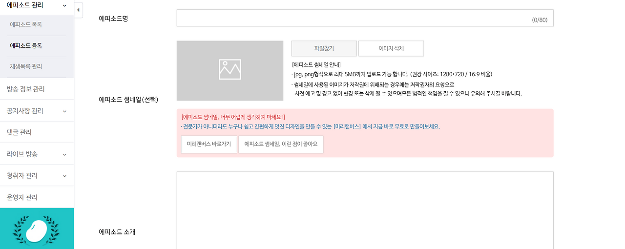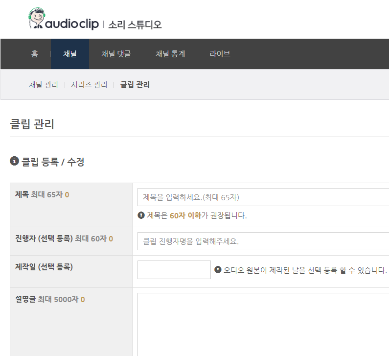클립관리메뉴에서 신규등록하는 화면의 일부분입니다. 팟빵에서 등록하는 경우와 마찬가지로 썸네일을 준비하고 작성합니다.