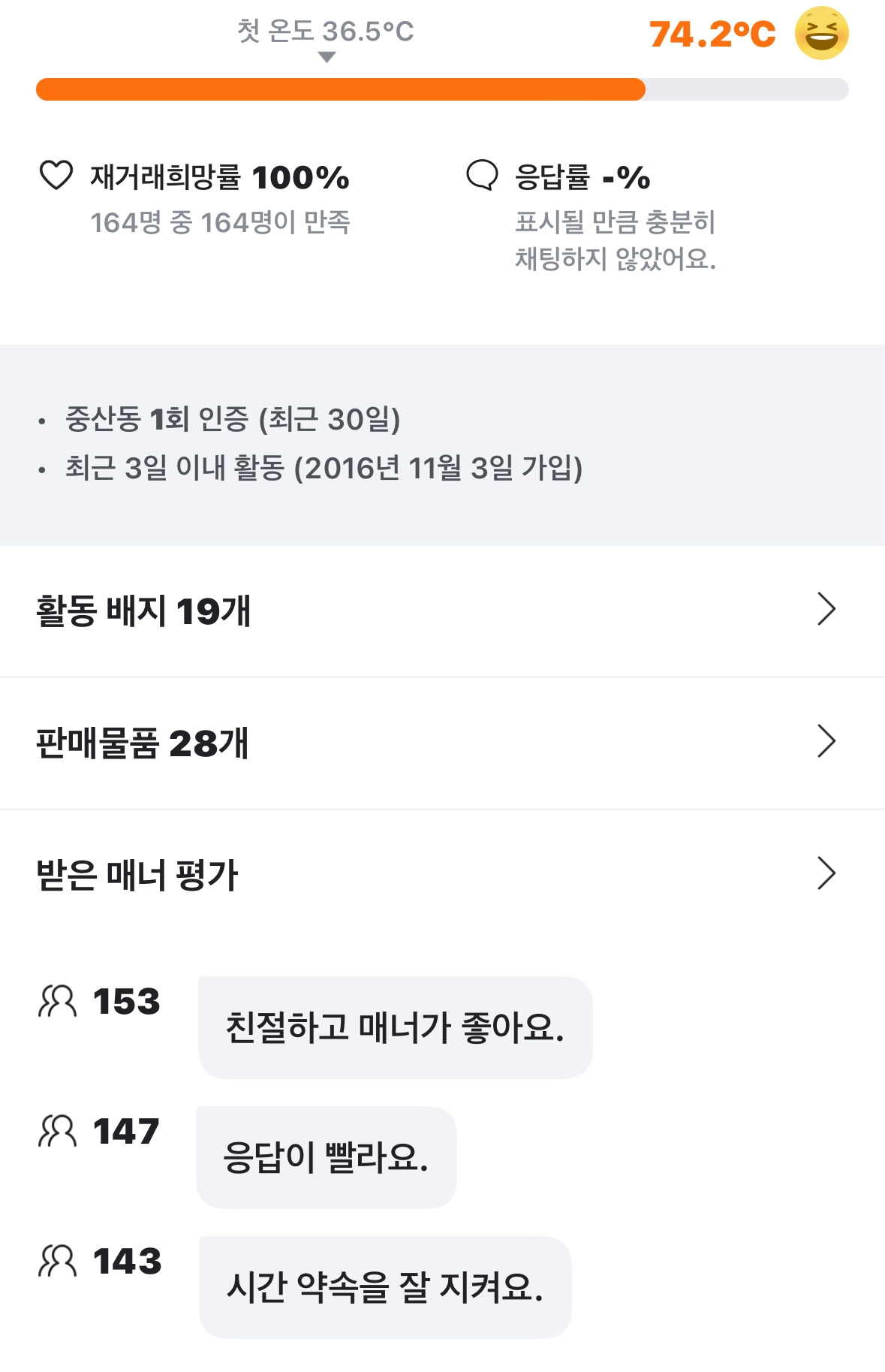 저는 당근 마켓을 하면서 늘 작은 기쁨을 느꼈거든요. 그런데 당근 마켓에 온도를 보고 어떤 분이 깜짝 놀라시는 거예요. 어떻게 이렇게 온도가 높을 수가 있죠??? 라며요. 그래서 저는 사람들이랑 거래하는 게 즐겁고 좋아해서 저도 기쁜 마음으로 거래하니깐 이렇게 온도가 높아졌나 봐요.라고 대답을 했죠. 처음에는 그 말을 듣고 칭찬인가라는 생각이 들었어요. 그분 표정에서 경외에 찬 눈빛과 신기하다는 듯한 표정을 지어 보였거든요. 당근온도 74도 / 거래횟수 120회