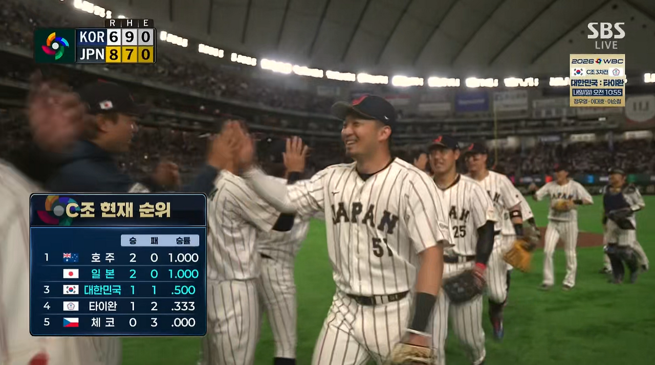 내일은 대만전이다(3월 8일, 도쿄돔 12:00). 대만이 오늘 체코를 콜드게임으로 꺾으며 타격감을 끌어올렸지만, 에이스급 투수 두 명을 이미 소모했다.