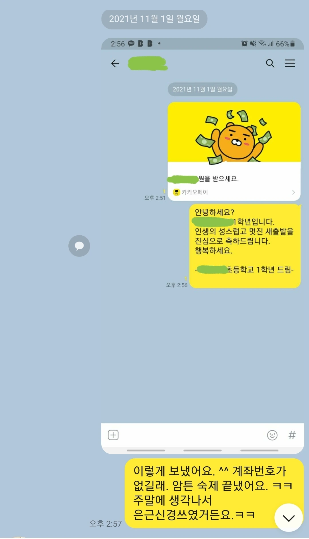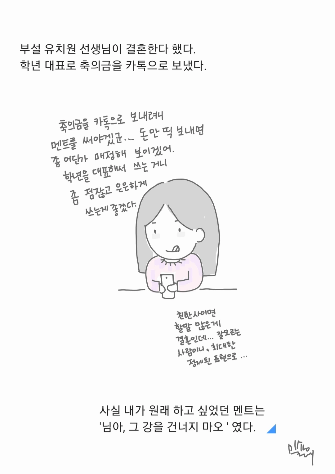"오늘 내가 학년 대표로 축의금 보냈거든? 근데 카톡으로 보내자니 멘트를 써야되서 고민했어"