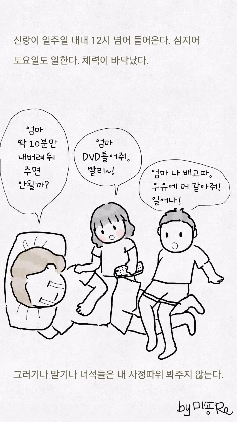 "엄마 쫌 만 누워있을께. 놀고 있어"