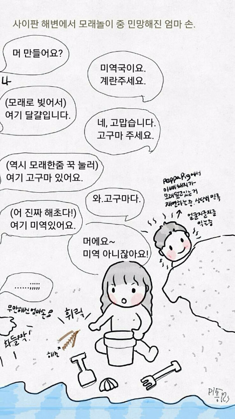 젖은 모래를 손으로 꾹 쥐었나 놓으니 정말 고구마와 비슷해졌다. 딸아이가 한번더 흡족한 웃음을 머금었다. 그때였다. 바닷물에 둥둥 떠있는 해초들을 보았다. 이거다 싶었다 미역국에 결정적인 재료. 녀석이 좋아하겠다. 그래 이걸 미역이라고 하자. 엄마의 넘치다 못해 폭발하는 센스였다.