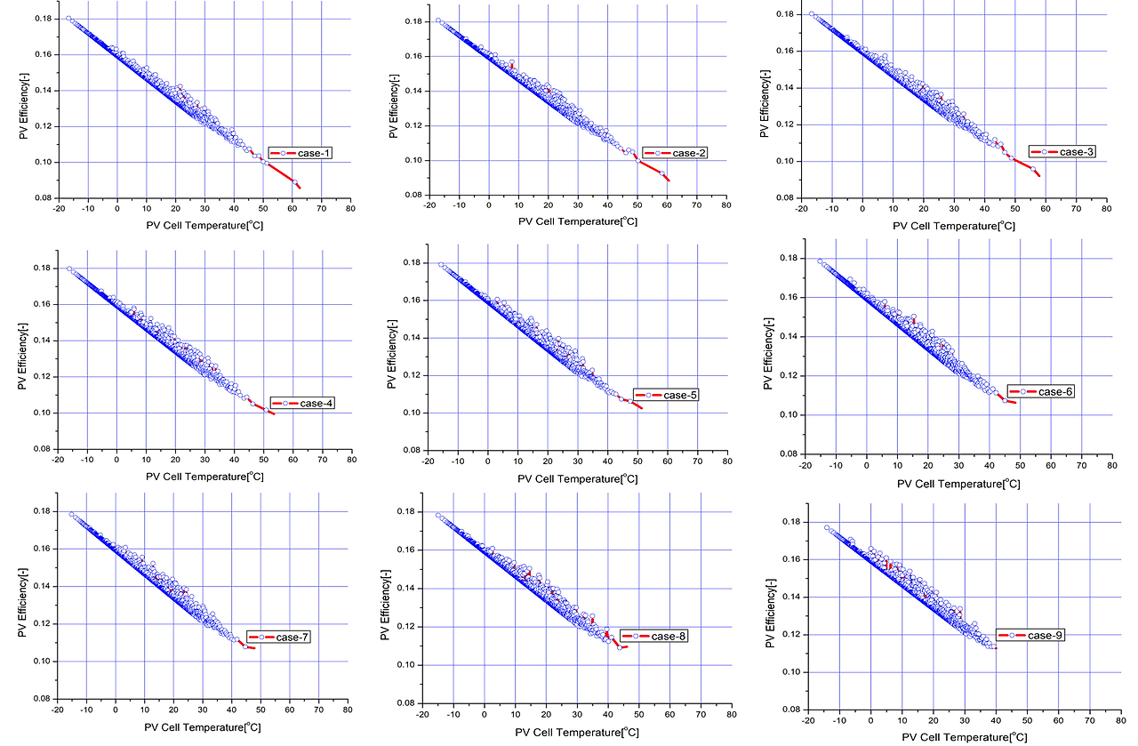 세번째 데이터는 CASE별 년간 BIPV 셀온도와 BIPV 발전효율 산점도 결과를 나타내고 있습니다. Re NO 증가에 따라 CASE별 셀온도 감소와 발전효율 증가 영역이 상대적으로 큰 것으로 확인되었으며, 특히, CASE-1 대비 CASE-9 에서 BIPV 발전효율 12% 이상대의 산점도 분포 영역이 넓게 분포되어있음을 확인하였습니다. CASE-1 자연대류의 경우 최대 셀온도가 67.6℃ 까지 상승하며 이때의 최저 발전 효율은 8.0% 까지 낮아짐을 확인하였다. Re NO가 가장 큰 CASE-9 강제대류의 경우 CASE-1 자연대류 대비 최대 셀온도는 36.3℃까지 떨어지며 이때의 최소 발전효율은 11.8%로 높아짐을 확인하였습니다.