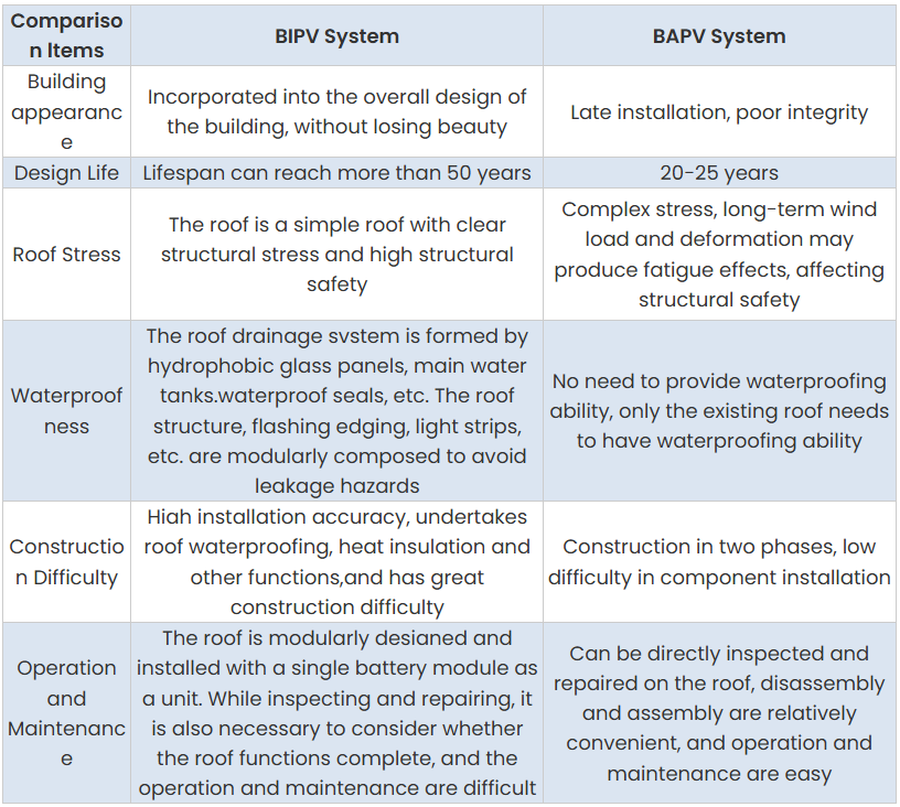 BAPV는 경사진 지붕 위에 거치된 일반 태양광 패널(예 : 기와 지붕 위의 패널)이나 건물 옥상의 거치식 배열 등이 해당합니다. BIPV는 태양광 지붕재(건물 지붕 그 자체가 태양광 모듈), 태양광 커튼월/창호(건물 파사드 유리를 태양전지로 대체) 등이 대표적입니다.