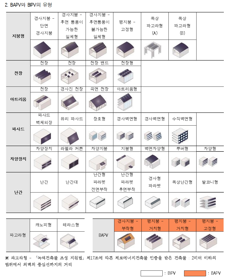 · BAPV : 건물부착형 태양광설비란 건축물 경사 지붕 또는 외벽 등에 밀착하여 설치하는 태양광설비의 유형을 말한다.