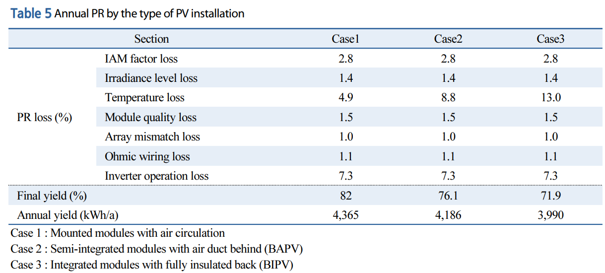 한 실험에서는 자연환기되는 지붕형(BAPV) 시스템의 연간 PR이 82%로 가장 높고, 배후에 공기덕트를 둔 준통합형이 76.1%, 완전히 밀폐된 BIPV형이 71.9%로 낮아졌습니다. 이는 통풍 여부에 따른 모듈 온도 상승 차이로 인한 결과이며, 밀폐형(BIPV)의 경우 최고 동작온도가 88.9℃까지 올라가 통풍형 대비 최대 28.5%의 온도손실이 발생한 것으로 분석되었습니다.