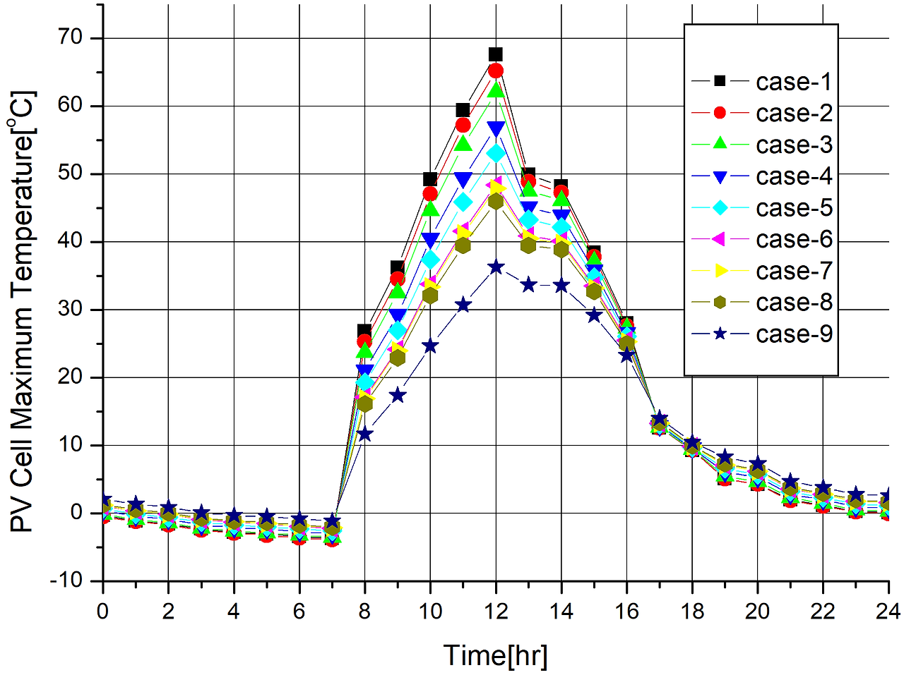 다음은 서울지역 기상데이터와 STC 조건하에 평가된 PV모듈 설치면적 40㎡을 대상으로 9가지 CASE에 대하여 최대 BIPV 셀온도 발생 시간과 BIPV 발전효율, 년간 BIPV 셀온도와 BIPV 발전효율, 년간 일사흡수율, 손실에너지, 발전량과 공조기 예열원으로 활용가치가 있는 유용에너지량을 분석한 결과 다음과 같은 결과가 나왔습니다.