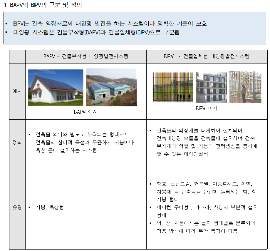 · BIPV : 건물일체형 태양광설비란 태양전지 모듈을 건축물에 설치하여 건축 부자재의 역할과 전력생산을 동시에 할 수 있는 시스템으로, 창호, 스팬드럴, 커튼월, 이중파사드, 외벽, 지붕재 등 건축물을 일부 또는 완전히 둘러싸는 벽, 창, 지붕 형태로 모듈이 제거될 경우 건물 외피의 핵심기능이 상실 또는 훼손될 수 있어 다른 건축자재로 대체되어야 하는 구조를 말한다.