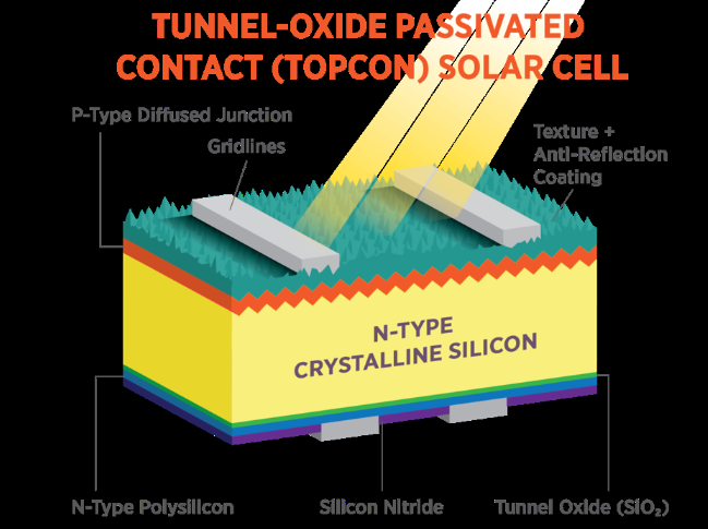 PERC 셀과 기본구조는 유사하지만, 초박막 터널산화막(SiO₂) 위에 인산도핑 된 N형 폴리실리콘층을 추가하여 접촉부 재결합을 감소시킵니다. 이를 통해 PERC 대비 약 1~2% p 높은 셀 효율을 달성하며 대규모 양산이 진행되고 있습니다.