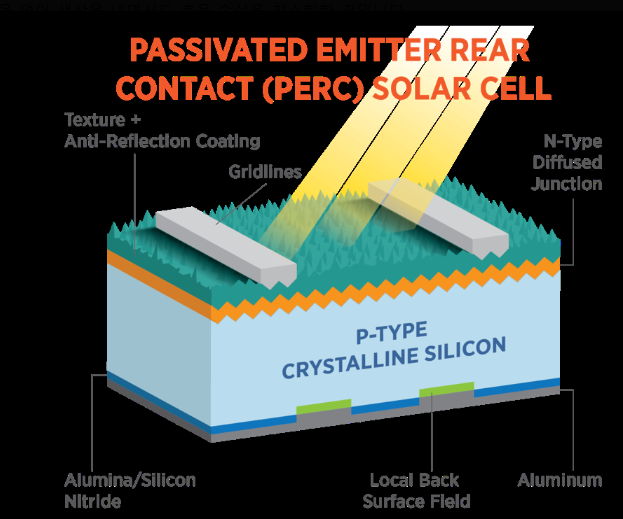 셀 앞면은 미세한 텍스처링과 반사방지막(ARC)으로 빛 흡수를 높이고, 뒷면은 Al₂O₃/SiNx 패시베이션 층과 국부 알루미늄 후면필드(Local BSF)를 형성하여 전자 재결합을 억제합니다. PERC 기술 도입으로 셀 효율과 출력이 크게 향상되었습니다. PERC 기술 도입으로 셀 효율과 출력이 크게 향상되었습니다.