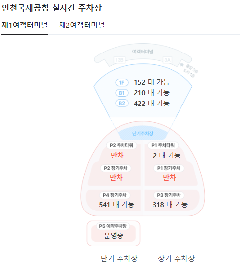 대부분의 항공사는 제1여객터미널을 이용하기 때문에, 주차공간이 넓지만 그만큼 주차하는 차량도 많다.