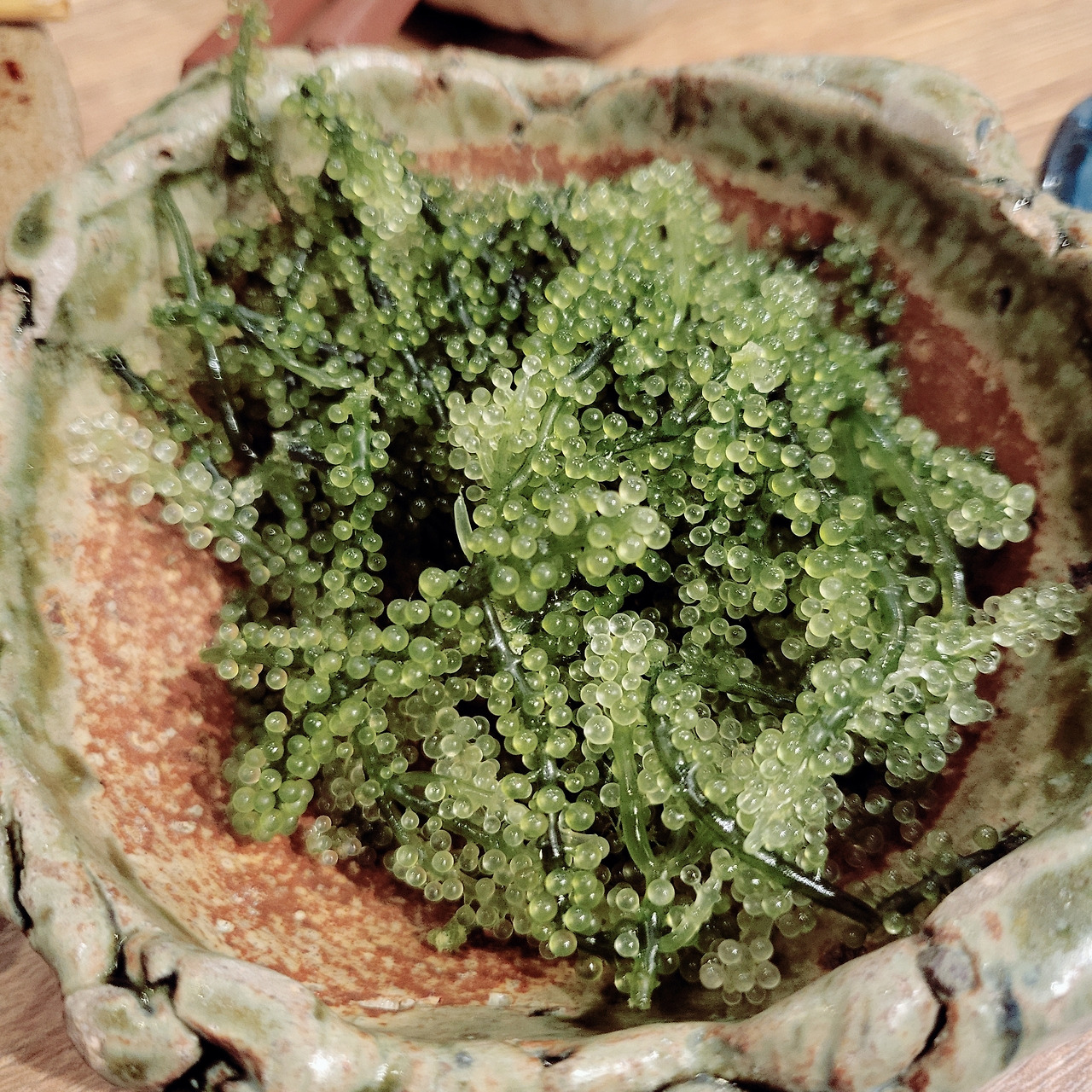 오키나와에서 맛볼 수 있는 특산품으로 ‘바다포도’가 있다. 일본어로 ‘우미부도’인 바다포도는 해초의 일종인데, 오독오독 터지는 식감이 재밌다. 짭조름한 액체가 안에 들어있다. 바다에서 나지만 비린 맛이 강하지는 않다. 이자카야에서 안주로 주문할 수도 있어서, 독특한 식감 때문에 자주 찾게 되었던 음식이다.