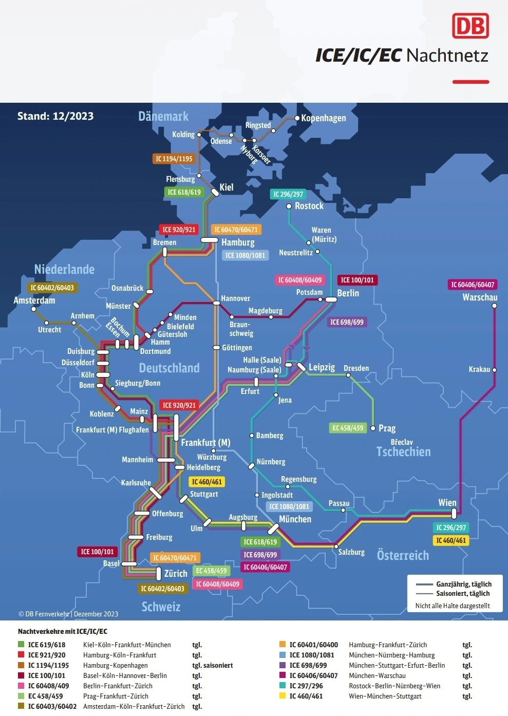 오스트리아 국철은 아직까지 아간 침대 열차인 나이트젯(NightJet) 열차를 운행중이나, 독일 국철(DB; 도이체 반)의 경우 모든 침대 편성이 사라졌다. 대신 밤을 달리는 야간 이체에(ICE)와 이체(IC) 그리고 유로시티(EC) 열차가 있다. 이번에 타게 된 열차는 뮌헨에서 출발하여 밤새 서서히 달리다가 괴팅겐부터 속도를 올리는 함부르크행 ICE 1080이다.
