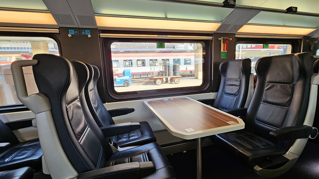 아무튼 탑승을 해서 지정된 자리로 가서 앉아 있으면 직원이 돌아다니면서 체크인을 한다. 이때 탑승권 QR(구글 월렛 등 가능)을 제시하면 된다. 인조 가죽 좌석은 깨끗하게 관리가 되어 있었고, 느낌도 나쁘지 않았다. 포근한 직물 시트도 좋지만 어느 날 기차에서 이곳 사람들이 신발을 신은 채 맞은편 좌석에 다리를 올리는 모습을 본 이후로는 이러한 가죽 시트를 더 선호하게 되었다.
