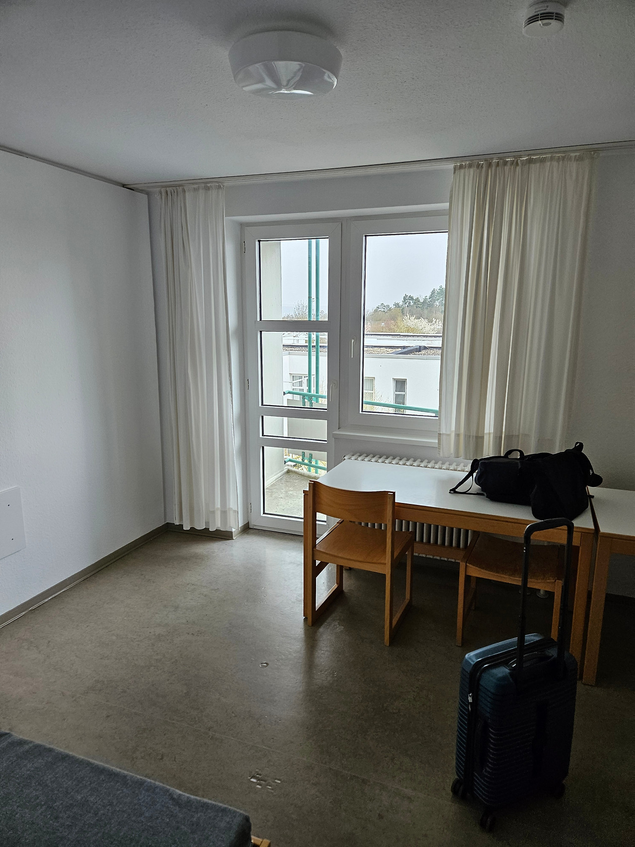 후블란트 기숙사에는 기본 가구와 와이파이 공유기가 제공되지만, 식기류 등 이외의 물품은 자체 조달해야 합니다. 사진에 보이는 커튼도 있는 방이 있고 없는 방이 있어요!