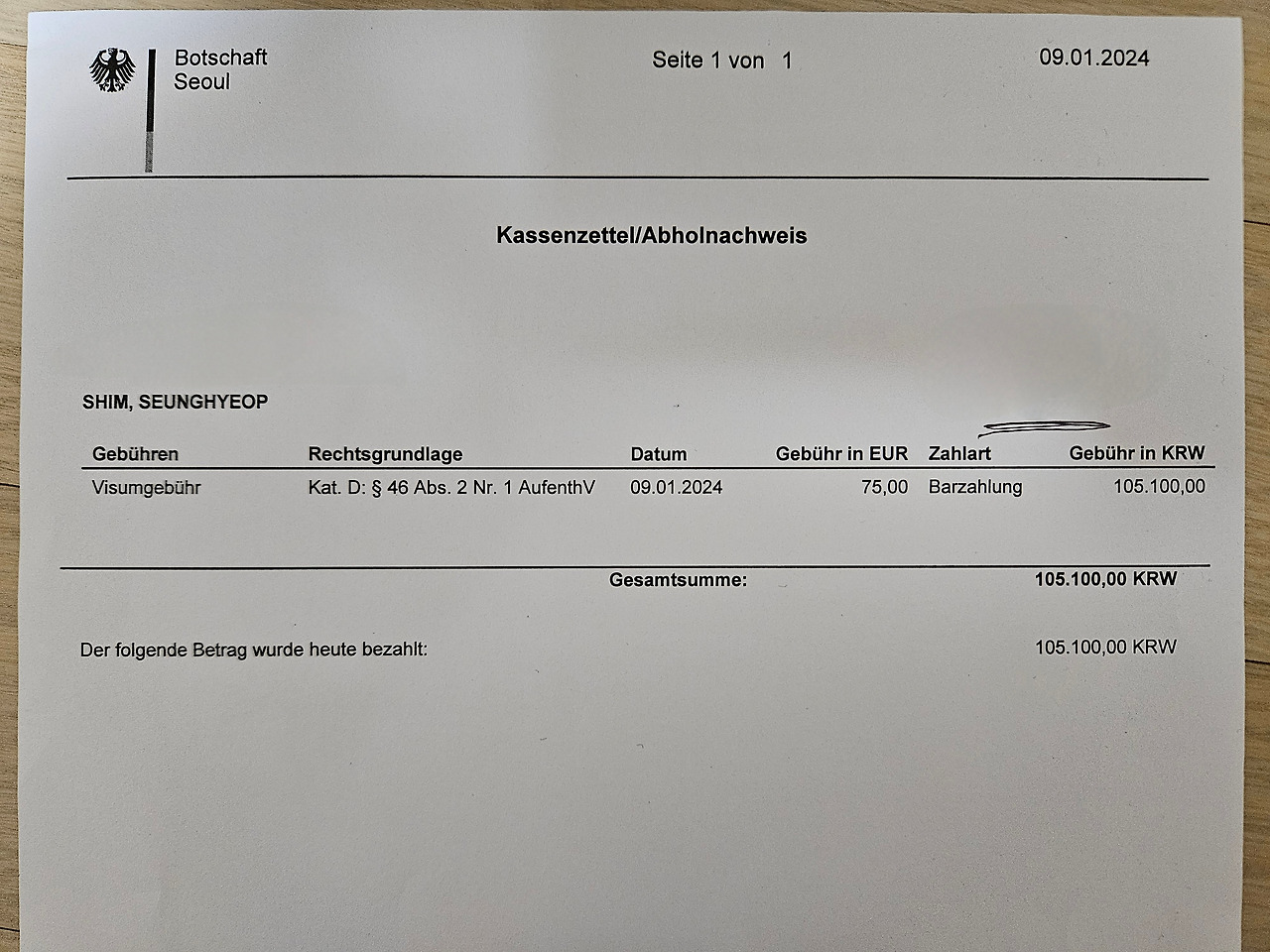 이후 지문을 등록한 후 75유로에 해당하는 금액을 현금으로 지불하면 모든 절차가 끝! 100원 단위까지 챙겨 받는 대사관이 쪼잔하다고 할 수 있겠으나, 환율의 경우 실제 은행에 고시된 그날의 환율보다 저렴했다.