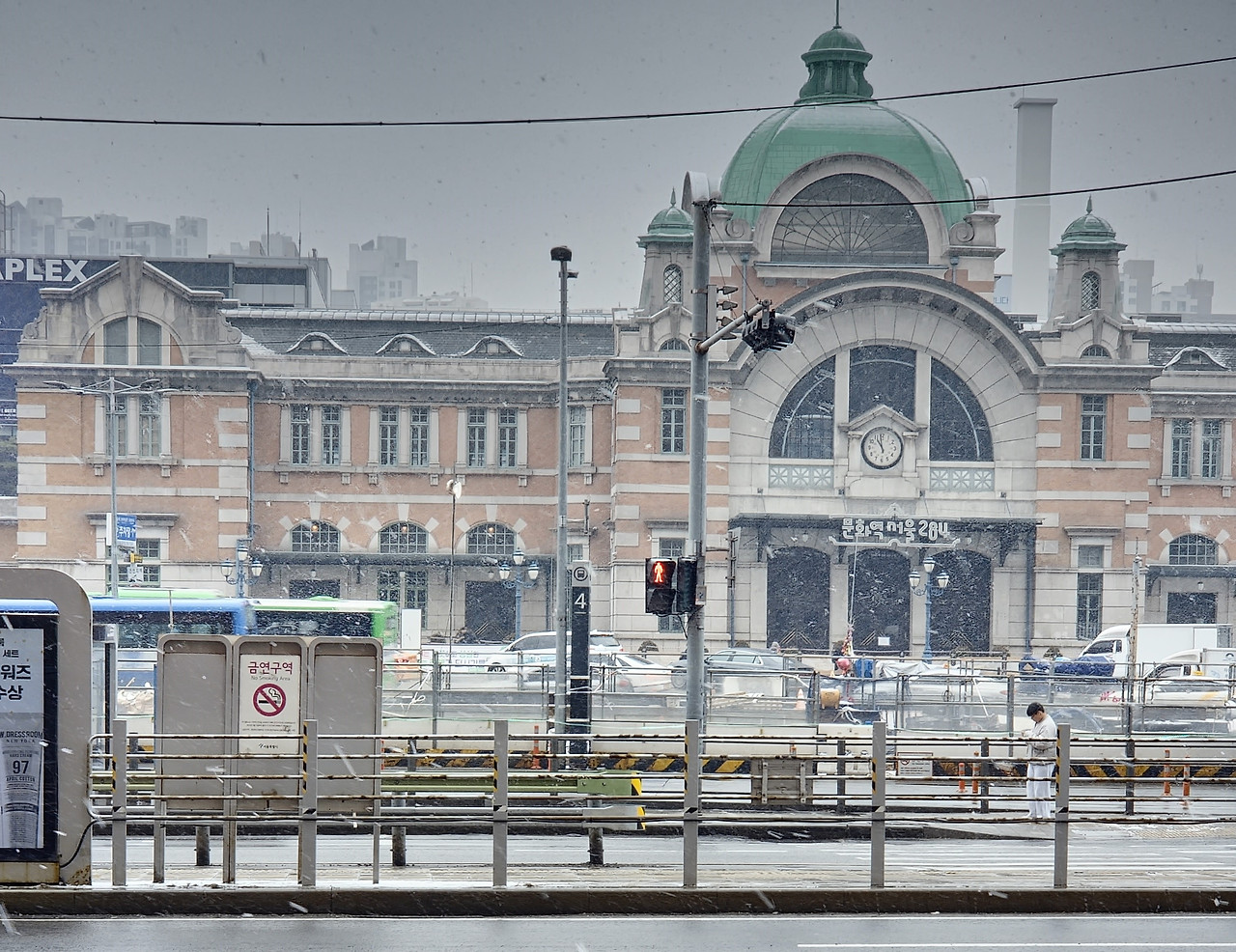 함박눈이 내리던 날, 기차역에서 내려서 지하 통로를 통해 서울스퀘어 방면 출입구로 나왔다. 서울스퀘어 빌딩 중간으로 가면 대사관을 알리는 현판과 함께 곰돌이가 환영해 주는 출입구가 있다. 우측 우리은행 지점에서 돈을 인출했고 가운데 인포데스크로 갔다. 독일 및 다른 유로존 나라들의 국기가 박혀있는 데스크(출입구 기준 우측)에 계신 분께 비자를 받으러 왔다고 하면 간단한 신분 확인 후 출입증을 받게 된다.