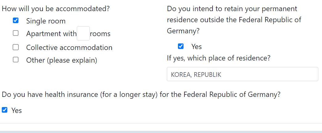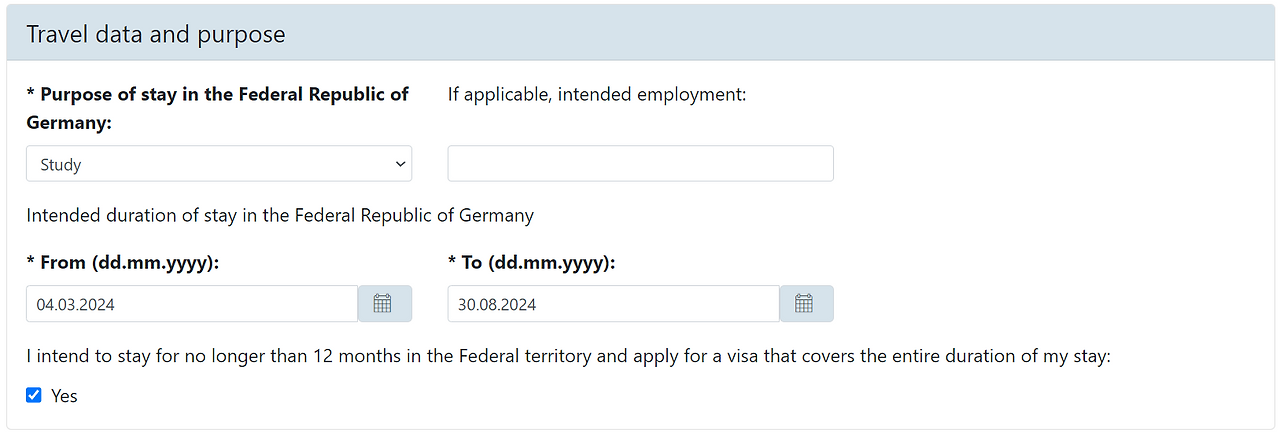 독일의 머무는 목적은 교환학생이니 Study, 그리고 아래 비자 기간을 선택하게 되는데, 이 날짜는 입학 허가서에 명시된 수업 날짜를 기준으로 발급이 된다! 나의 경우 선행 코스가 있어서 3월 4일로 잡았는데 대사관에서 이 부분에 대하여 질문을 받았다. 다행히 JMU의 경우 선행 코스에 대한 설명이 입학 서류에 명시되어 있어 추가 서류나 증명 없이 신청을 마칠 수 있었다.