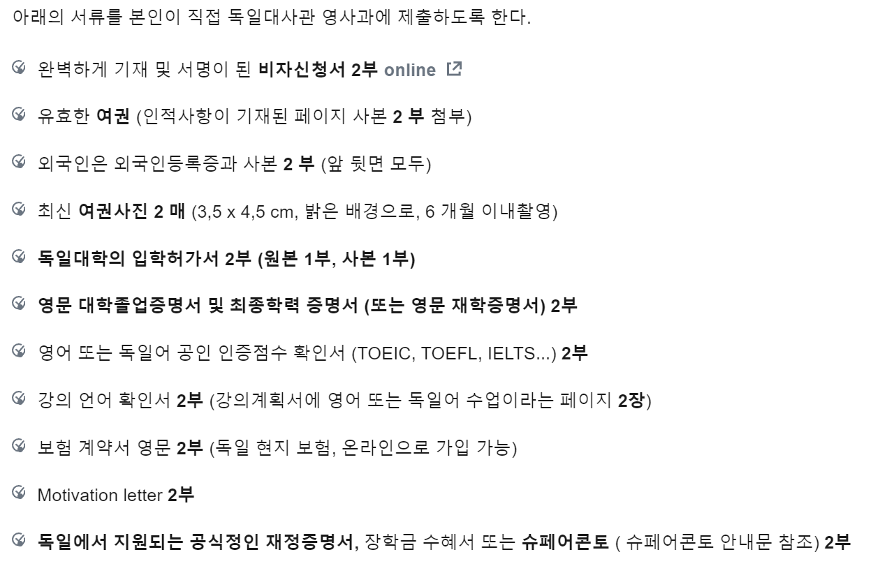 이 편지에서 가장 중요한 점은 비자 받은 이후에 내가 독일에 눌러살겠다라는 취지로 쓰면 안된다는 이야기가 있다. 진위 여부는 모르겠으나 아마 불법 채류자가 될 싹을 시험(?)하는 느낌인데, 그래서 전반적인 내용을 독일에서 공부하고 한국에 돌아와 경험을 잘 접목시키고 싶다와 같이 적어주었다.