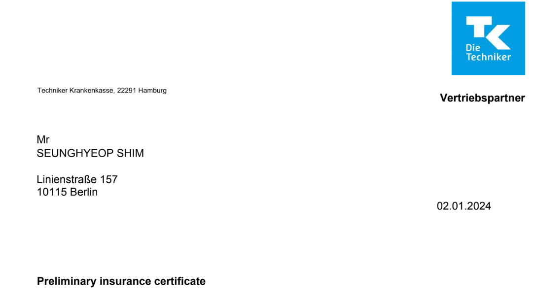 보험 계약서는 사보험의 경우 비자 신청 기간만큼 보장하고 있는지를 확인하여 가입하면 되는 듯싶고, 필자의 경우 공보험(TK)을 제출했는데, 공보험의 경우 정규 학기만 보장하므로 선행 코스 등으로 신청 기간이 앞선 경우 공보험 공백 기간을 커버해 줄 보험이 필요하게 된다. 아마 대부분 슈페어콘토 가입하면서 공보험을 함께 처리하므로 패키지 가입할 때 같이 가입되는 여행자보험(사보험)으로 해당 부분은 처리했다.