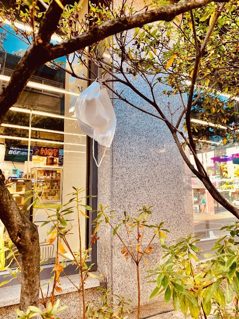 일요일 아침에 집 근처 편의점에서 우유를 사 가지고 나오다 목격한 장면이었다. 편의점 옆 화단에 심어진 나무에 마스크 하나가 대롱대롱 매달려 있었다. 그 장면이 하도 기이해서 사진도 찍었다. 하관의 모양새가 잡혀있는 걸로 봐서 새 마스크는 아니었다. 어느 취객이 술기운에 빌어 장난친 게 틀림없다고 생각했다. 형편없는 시민의식을 탓하며 혀를 차고 그냥 지나치려다가 잠깐 멈췄다. 매달린 마스크를 유심히 살펴보니, 촘촘히 묶어낸 매듭의 모양새가 술주정으로 버린 것 치고는 정성이 깃들어 보였다. 마치 마스크가 오랫동안 나뭇가지에서 버텨주길 바라는 마음으로 매단 것 같았다.