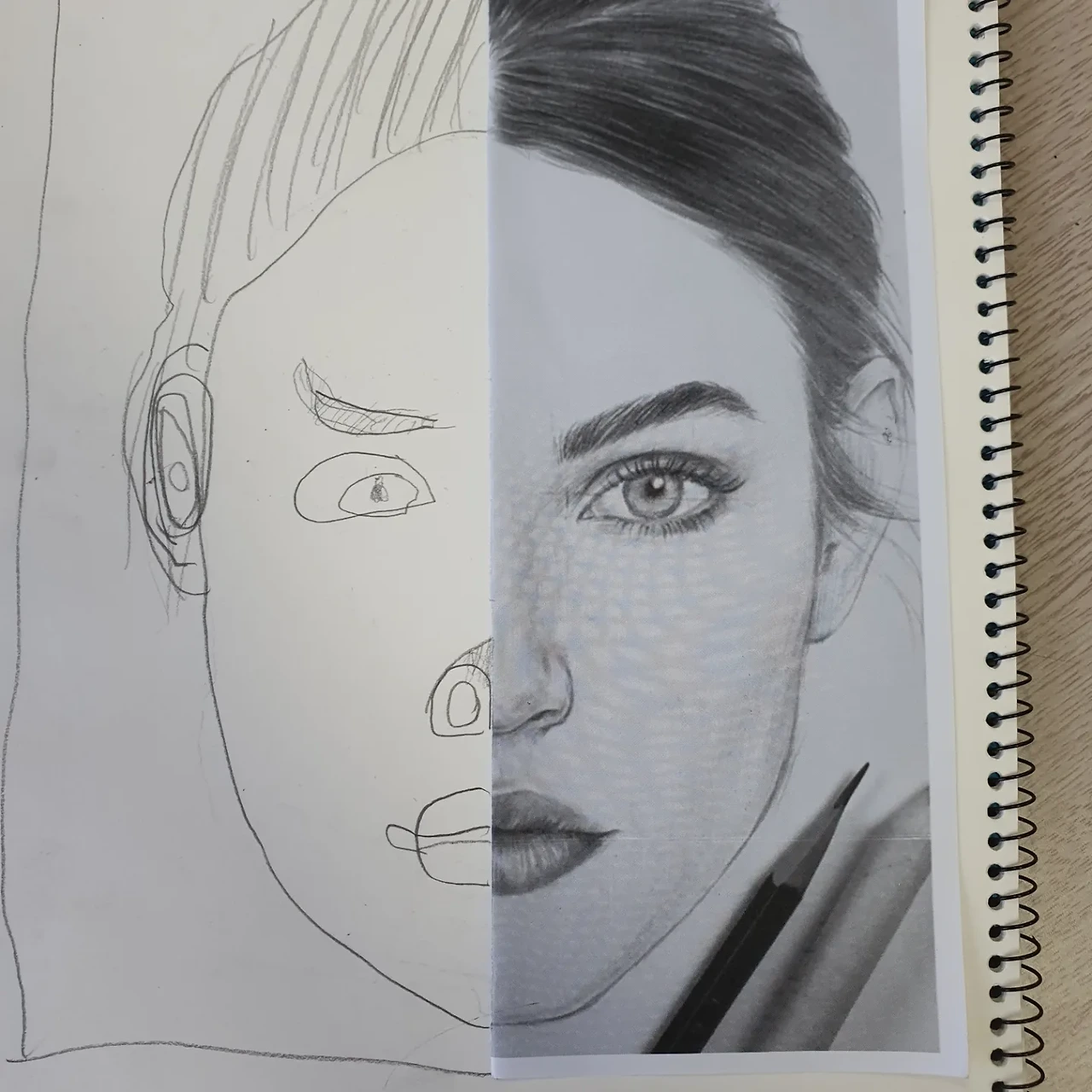 한 여인의 반쪽을 주고 대칭을 설명해주고 어디쯤 눈, 코, 잎을 그려야 할지 선은 연필을 눕혀 쓸 때와 세워 쓸 때, 그리고 연필의 굵기에 따라 어떤 느낌이 드는지 설명해주었다.