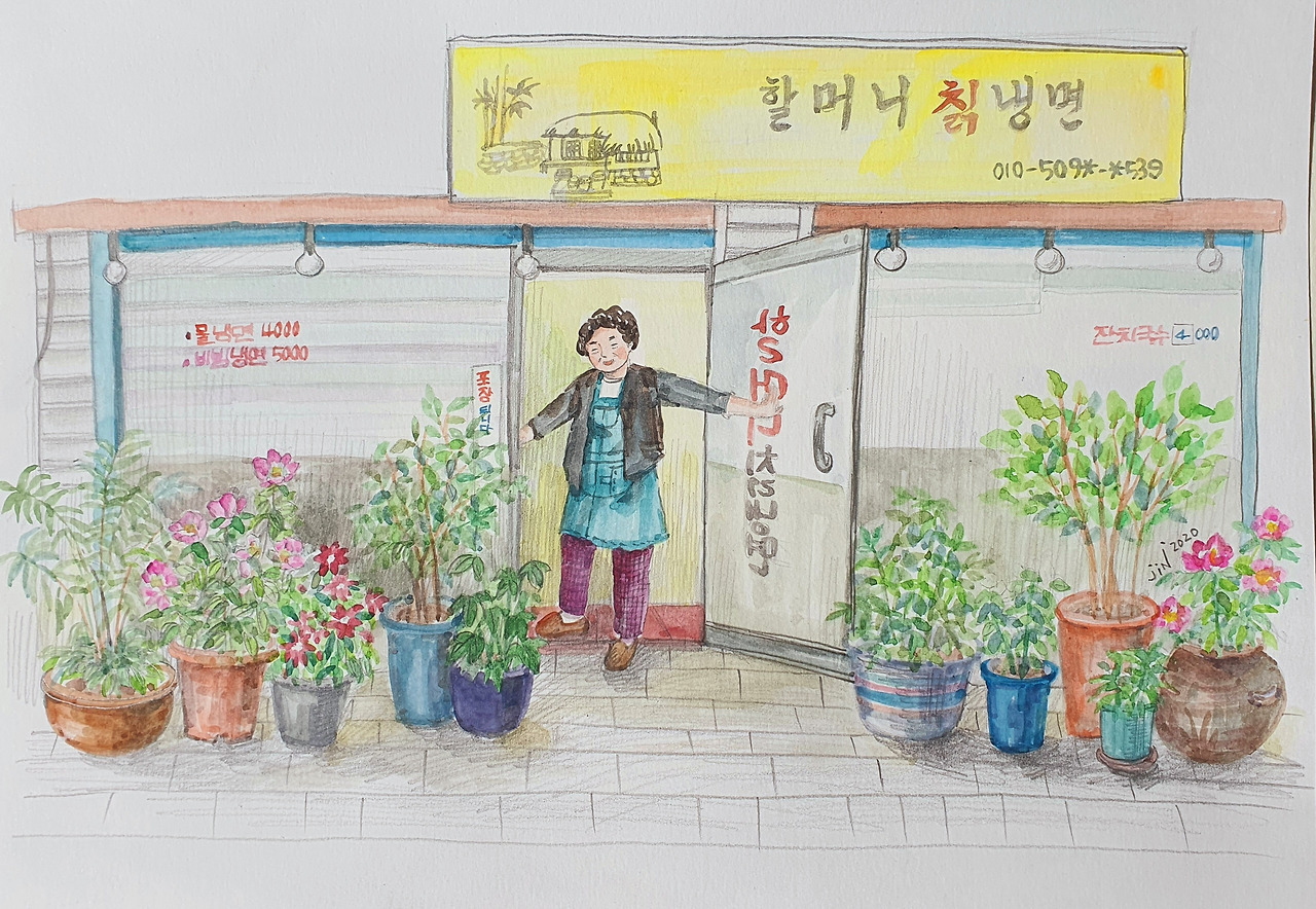 지동 작은 골목 식당 중 하나인 할머니가 만들어주시는 냉면을 후루루 짭짭 맛나게 먹고 있으면 조용히 다가와 '부족하면 더 줄게~'라고 이야기해주실 땐 할머니의 손녀라도 된 것인 양 마음이 흐뭇해진다. 냉면집 앞에는 화분이 가득 있다. 계절마다 다른 꽃을 피우고 다른 식물이 자란다. 할머니는 서천꽃밭의 한락궁이처럼 여러 꽃들을 정말 잘 키우신다. '다음 주엔 냉면집 앞 함박꽃이 활짝 필 거야~' '하는 할머니의 얼굴은 벌써 함박꽃이다.