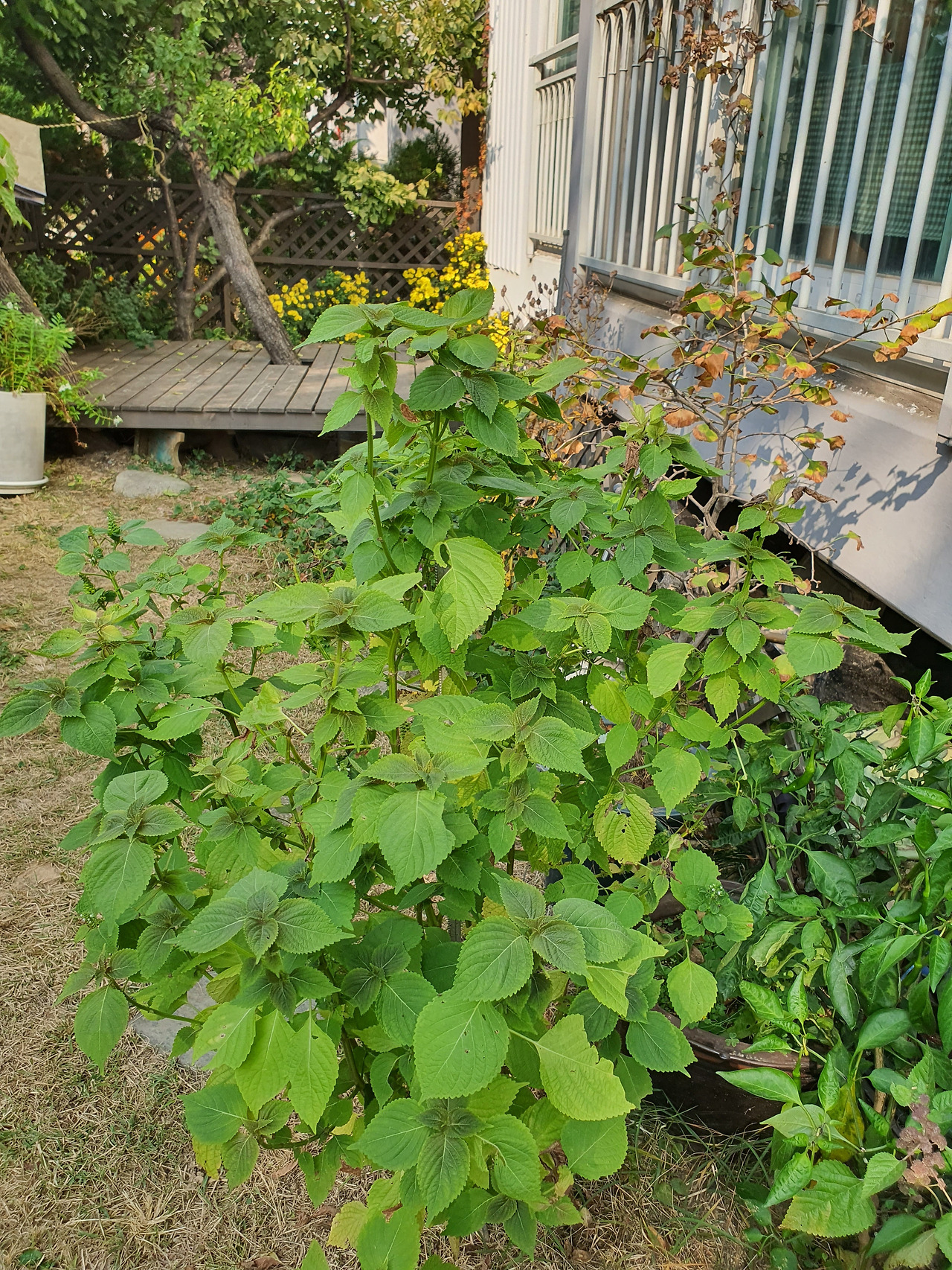 지난봄에 깨 모종 하나가 길에 떨어져 있어서 주워다,우리집 마당에 심었다. 깨를 심어 본적은 처음이다. 다행이 보답이라도 하려는듯 나무처럼 자랐다.