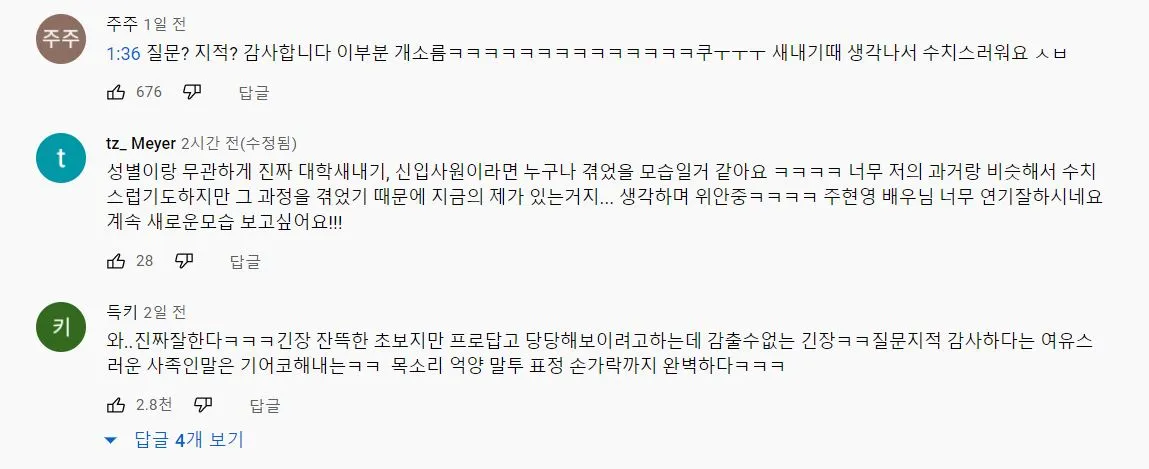 '똑 부러지는 자신의 모습을 상상하며 열심히 준비해 발표 장소에 올랐는데 예상치 못한 양상으로 전개되면서 내가 무슨 말을 하는지 나도 모르겠고 어버버버 뚝딱뚝딱거리다가 결국 말아먹고 내려오는' 우리네 대학교 ppt 또는 면접 등을 충실하게 고증했다고 호평이 자자하다. SNL 인턴 기자 역의 주현영 배우는 본인의 연기력을 단 하나의 캐릭터로 증명해 극찬을 받고 있다. (저 과하게 힘이 들어간 눈동자를 보라) 실제로 저런 성격이 아닐까 의심이 될 정도였으니.