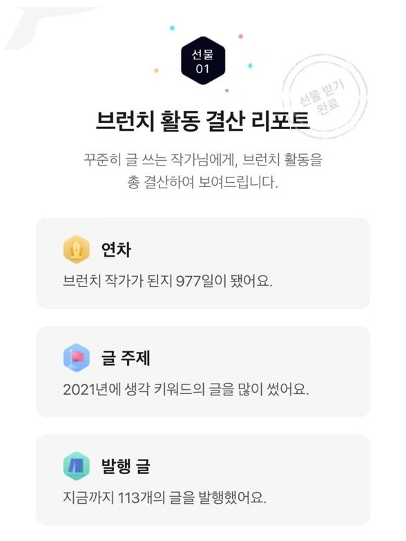 최근 브런치에서 온 결산 리포트. 별 것 아닌 리포트일지 몰라도 그간 '작가'라는 타이틀로 활동했던 시간을 돌아보는 계기가 되었다. 브런치 팀의 디테일한 이벤트에 감사를.