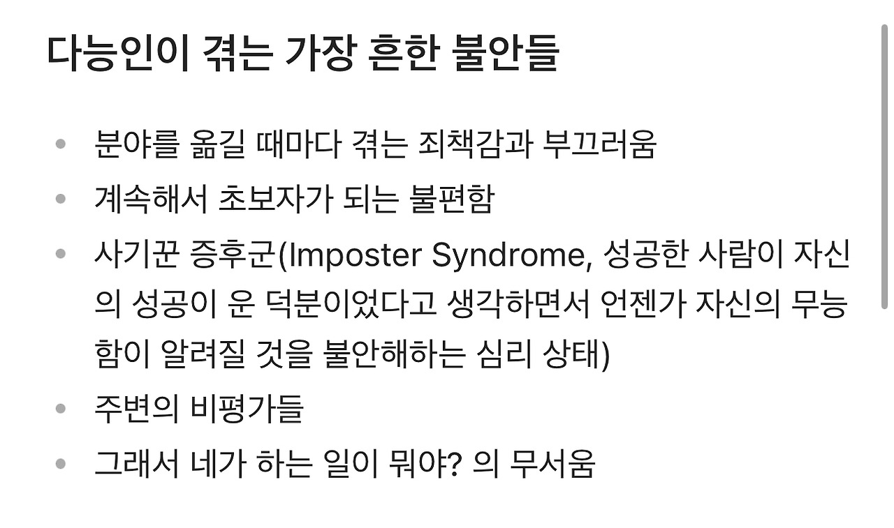 특히 이 책에서는 다능인이라면 느꼈을 죄책감, 불안감에 대해서 다루는데 너무 내 얘기 같아서 공감이 되고 소름이 돋았다. 나만 이런 고뇌를 느끼고 사는 게 아니라서 위안이 되기도.