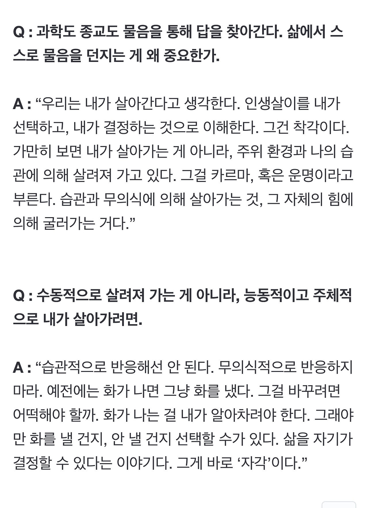 그렇다면 이 '살아지는 삶'에서 벗어나려면 어떻게 해야 하나, 스님은 '자각'에 대해 강조한다.