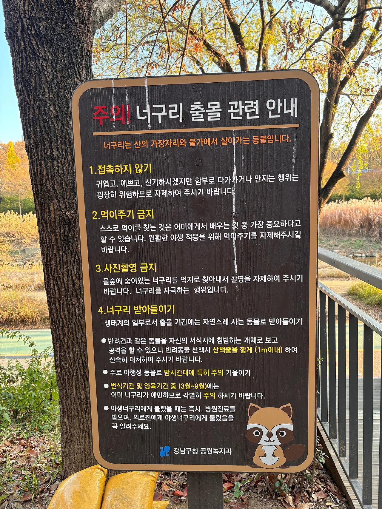 근데 이제 와서 돌이켜보니 조금 이해도 된다. 양재천에는 강아지 산책을 시키는 시민들이 많다. 호기심 많은 강아지는 야생동물을 보고 다가갈 수도 있을 것이고, 그런 강아지에게 위협을 느낀 너구리가 선빵을 칠 수도 있을 거다. 너구리는 광견병의 숙주다 보니 유혈 사태가 벌어지면 강아지와 견주에게 치명적일 수 있다. 그래서 너구리는 받아들일 수 없다, 포획해서 살처분해야 한다고 주장하는 시민들이 있었겠다 싶다.