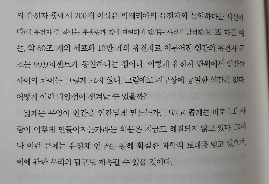 인간은 서로 다른 두 세계에 살고 있으며, 이 둘 사이를 쉽게 오간다. 한쪽 세계에서 우리는 사실과 데이터를 중시한다. 다른 쪽의 세계에서 우리는 사랑하고 괴로워한다. 특히 인생을 즐기는 순간에 우리 몸의 유전자적 구성 따위는 아무런 의미도 관심도 없다. 이쪽 세계에서 우리는 과학을 추구한다. 저쪽 세계에서 우리는 플루트를 연주하고 시를 읽는다. 전자의 세계에서는 정보를 구해 질문에 답할 수 있다. 하지만 후자의 세계에서는 그럴 수 없다. (p.33)
