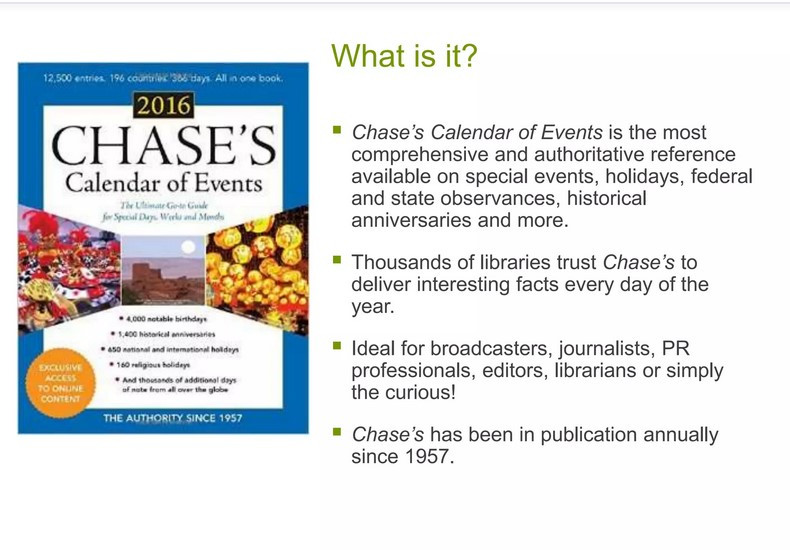 하시겠지만, 이 날은 1973년에 체이스 기념일 달력(Chase's Calendar of Events)에 공식적으로 이름을 올렸습니다. 체이스 기념일 달력(Chase's Calendar of Events)은 전 세계의 공휴일, 기념일, 특별한 날들을 매년 수록하는 책인데요, 우리가 잘 알고 있는 기념일뿐 아니라 독특하고 역사적인 날들도 포함되어 있습니다. 주로 교육자, 행사 기획자, 미디어 종사자들이 기념일이나 콘텐츠에 활용할 날짜를 찾기 위해 사용하고 있답니다.