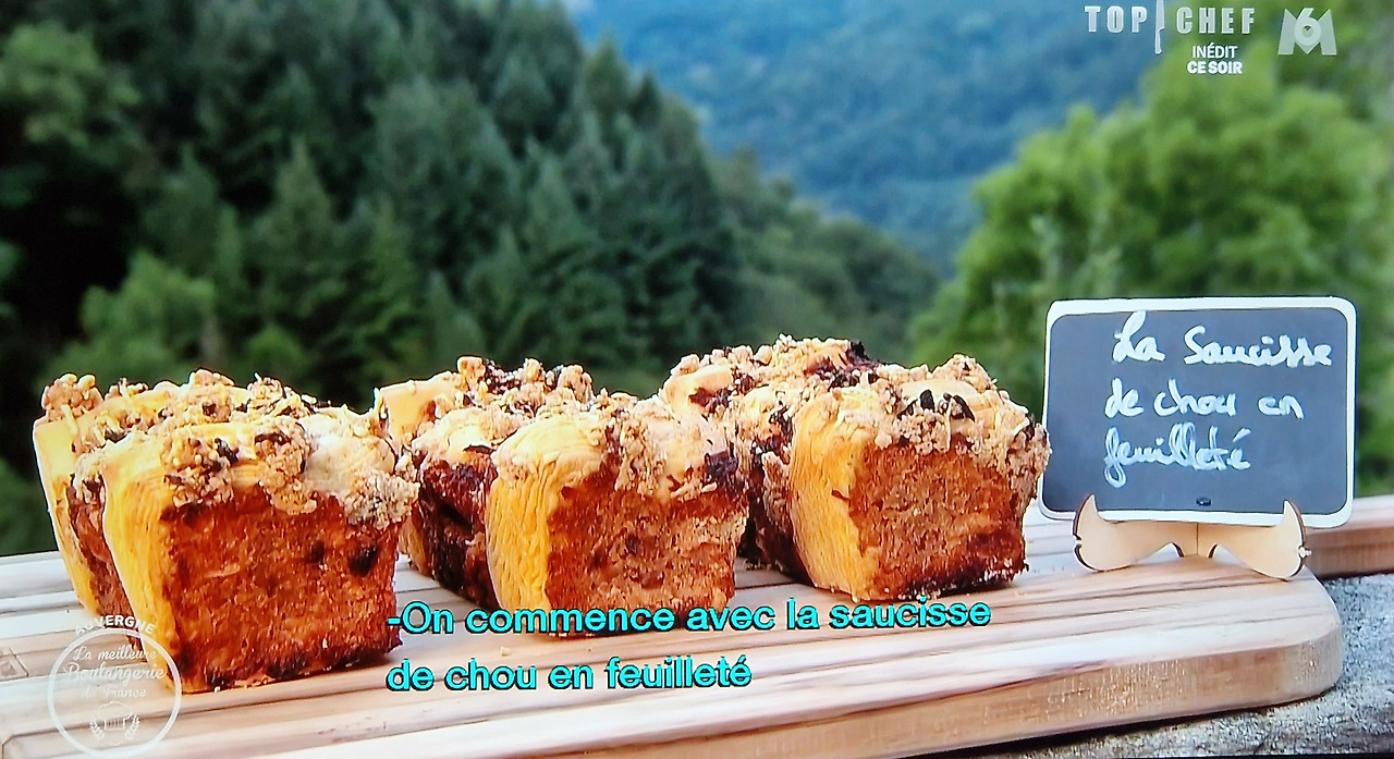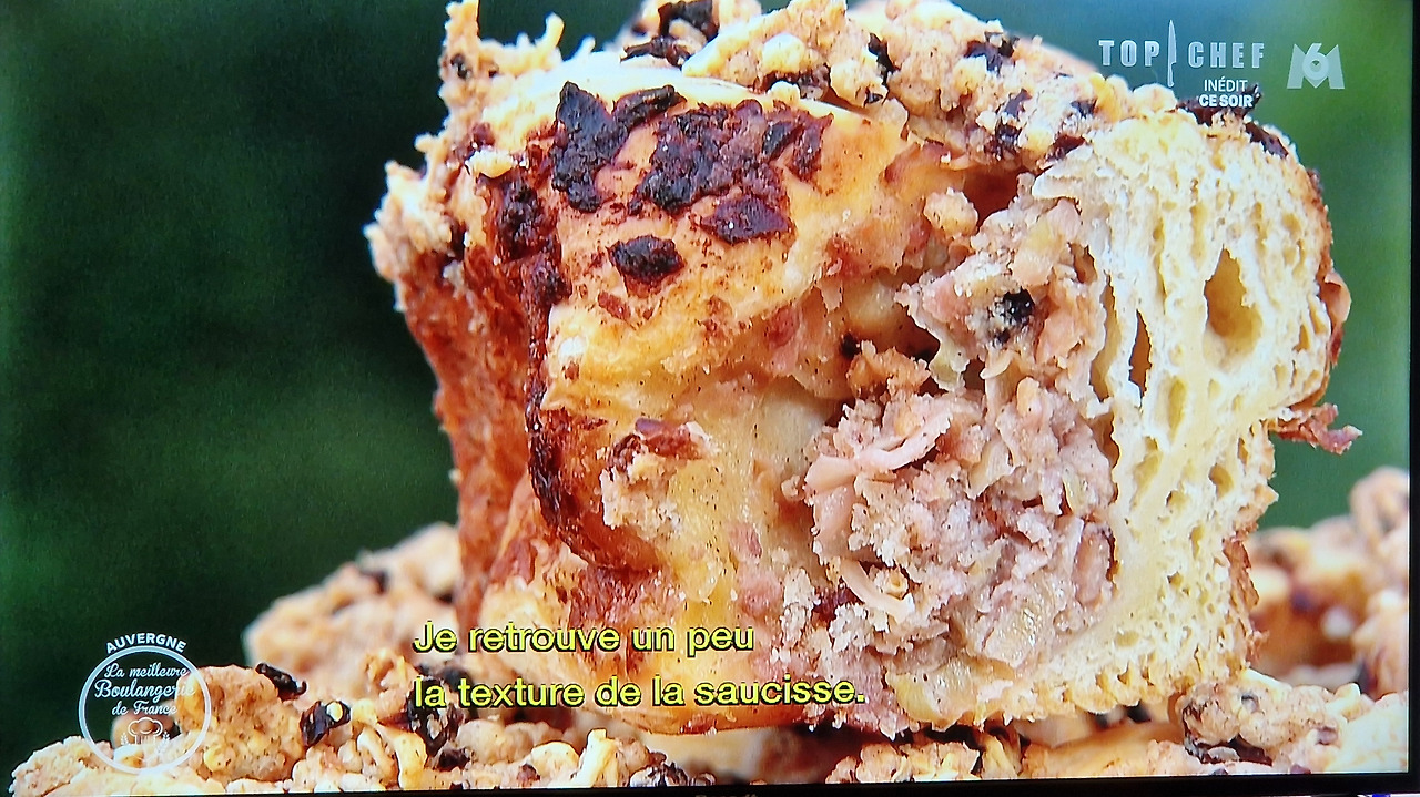 심사위원이 제시하는 재료는 보통 지역특산품이다. 최근에 본 프로그램에서 제시된 재료는 지역 특산품인 양배추 소시지였다. 보통 소시지를 넣은 빵은 프랑스에서 찾기 힘든데 이런 제안이 신기하고 재밌었다. 아래 사진은 경쟁에 출품한 "소시지를 으깨어 넣은 빵"이다.