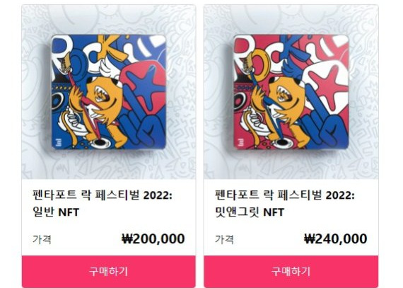 워터밤에 이어 펜타포트 록 페스티벌(3PM | 펜타포트 록 페스티벌)도 250매 한정판 NFT를 발행하였다. 특히 밋 앤 그릿 NFT는 현장 굿즈 교환 외 아티스트와의 팬미팅 기회가 주어진다. 팬은 자신의 메타 마스크 지갑에 티켓을 기념품으로 남길 수 있으며 기획자는 고객 분석 데이터를 확보할 수 있다.