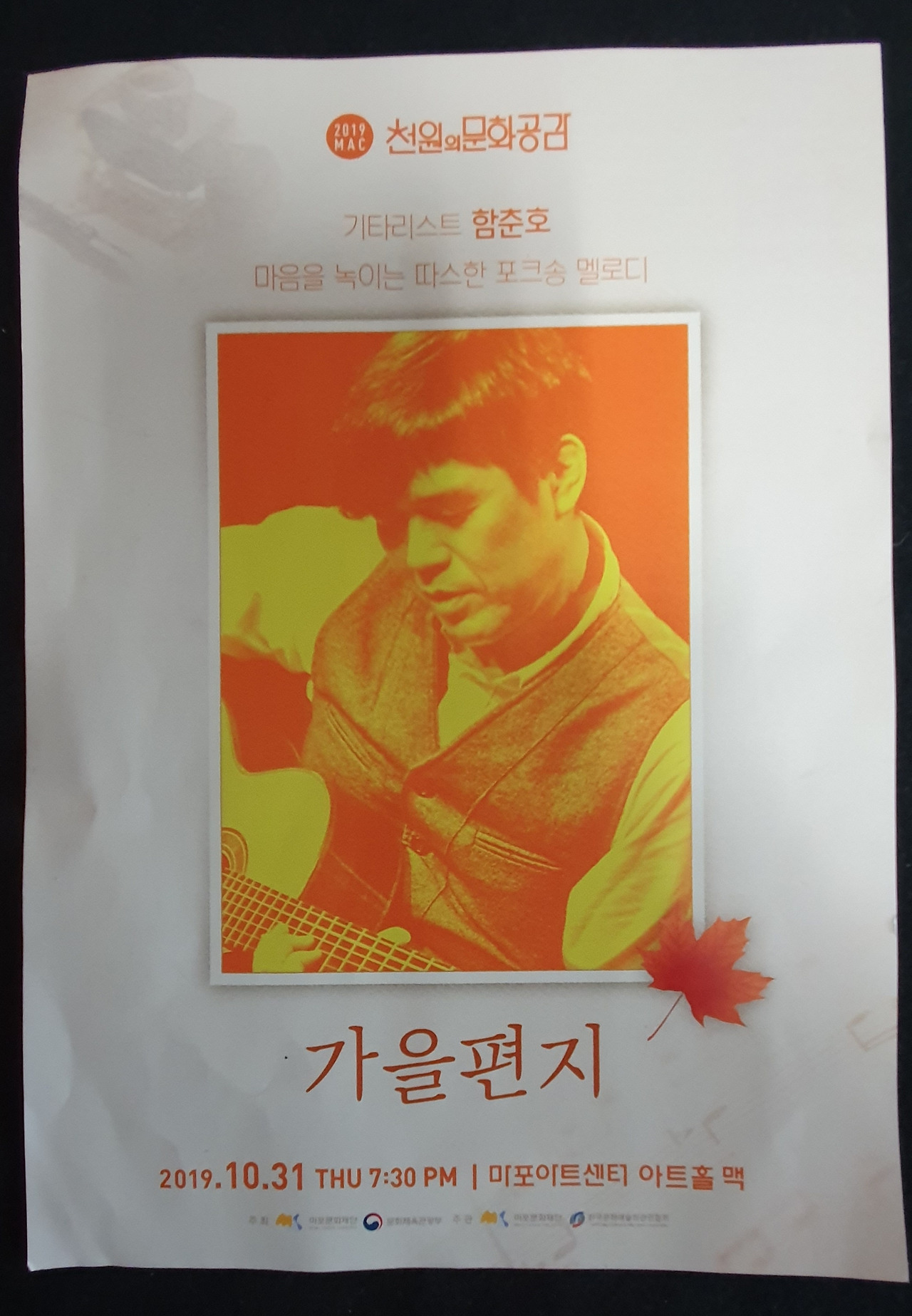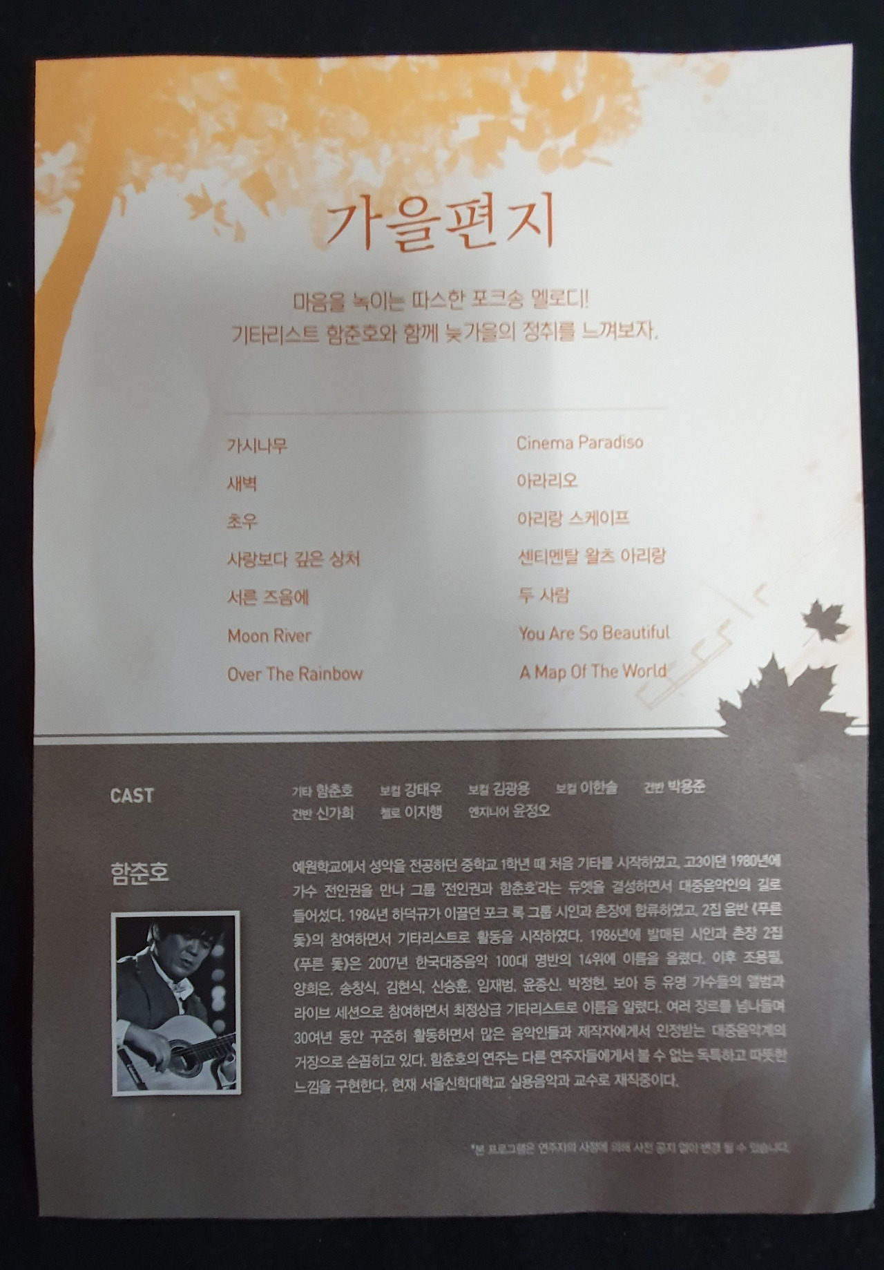 공연의 정식 제목은 <기타리스트 함춘호와 함께 하는 '마음을 녹이는 따뜻한 포크송 멜로디-가을편지'>입니다. 함춘호 님의 기타 소리와 마포아트센터 아트홀 맥을 가득 채운 관객들의 박수소리로 공연은 시작되었습니다.
