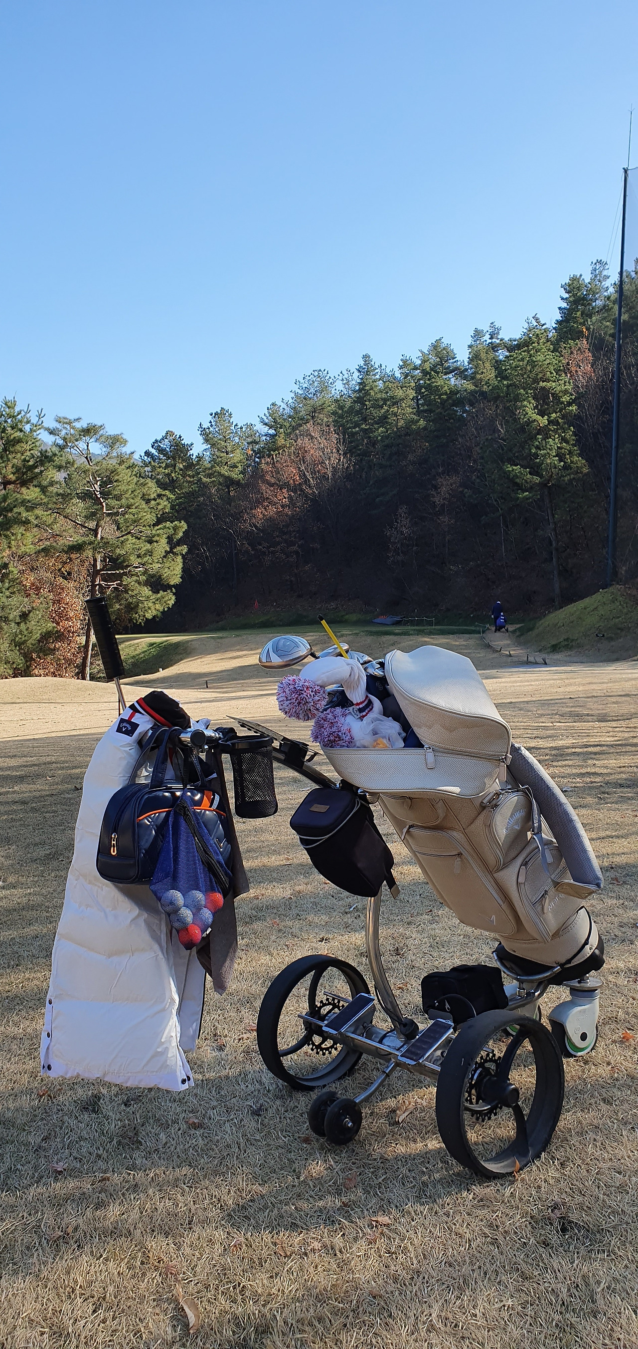 이런 반복되는 과정으로 9번 홀까지 돌고, 같은 코스로 돌아와서 다시 한번 더 돌게 됩니다. 결국 18홀 전부 제 발로 오롯이 걷고, 거기다 힘껏 카트를 밀고 당기면서, 방향조차 봐주는 사람 없이 초보 맘대로 막무가내 정신으로 라운딩을 마쳤습니다. 중간에 쉬는 시간도 없이, 전반 후반 각 화장실 한 번씩 들른 것뿐입니다.