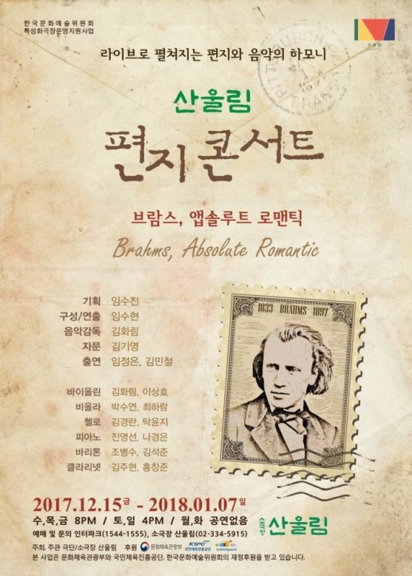 몇 년 만에 찾아간 ‘산울림 소극장’에서 인문학과 클래식 음악, 연극과 라이브 연주의 만남을 통해 불멸의 작곡가들의 삶과 예술을 재조명하는 ‘편지 콘서트’를 진행하고 있었다. 2013년부터 시작해 올해가 다섯 번째 무대지만, 이번이 처음이다. 편지 콘서트라는 타이틀만으로도 마음이 끌리는데, ‘브람스’라는 이름이 더해지면서 꼭 봐야겠다는 결심이 섰다. 공연 시간이 임박하자 객석이 하나씩 채워졌다. 내 옆자리에 일흔쯤으로 보이는 노부부가 앉았고, 딸과 함께 온 사람, 중년의 여자들끼리, 중년의 커플들이 주를 이뤘다. 매번 느끼는 것이지만, 산울림 소극장은 대학로의 소극장들과 달리 다양한 연령대가 찾는다는 특징이 있다.