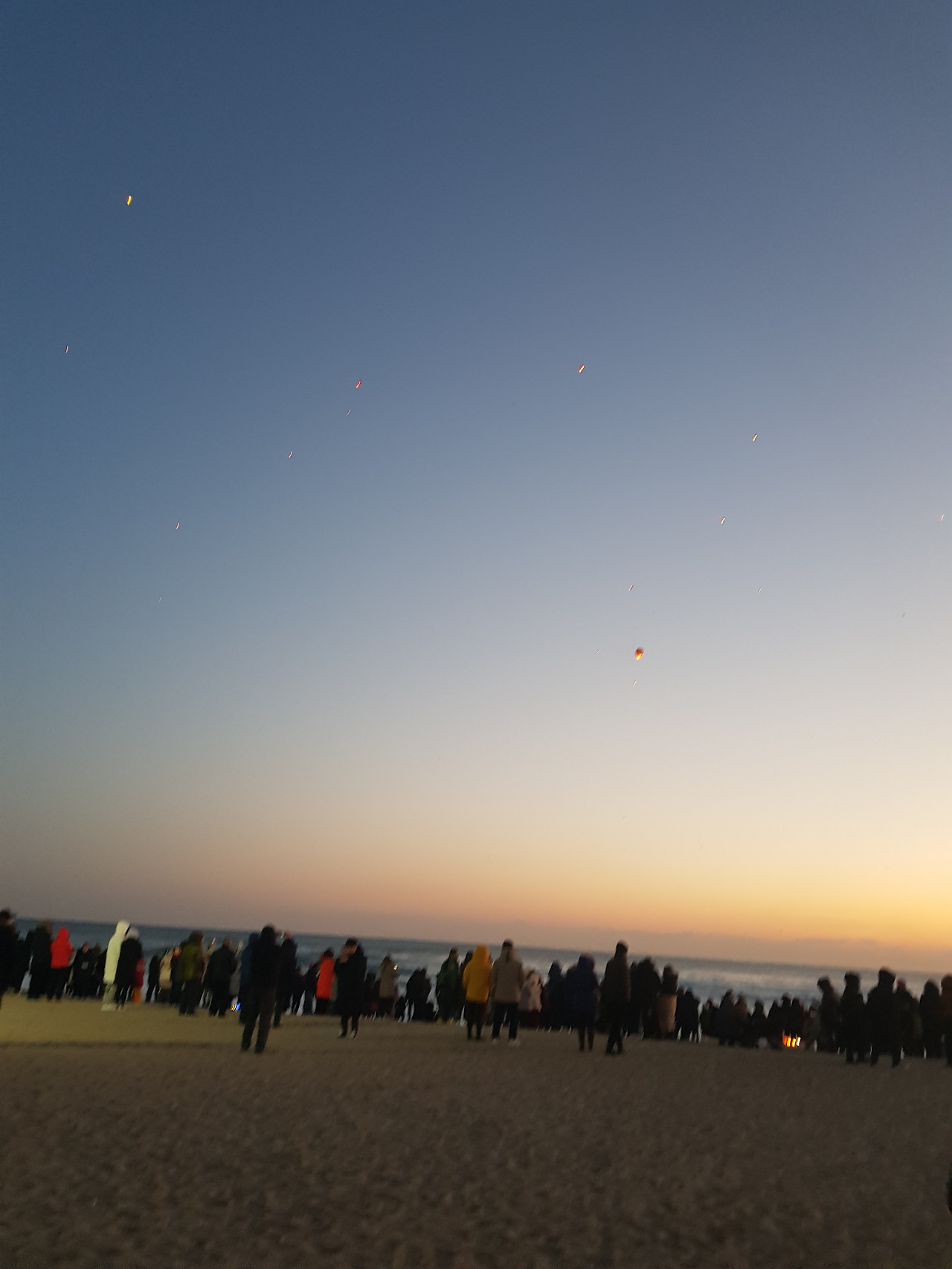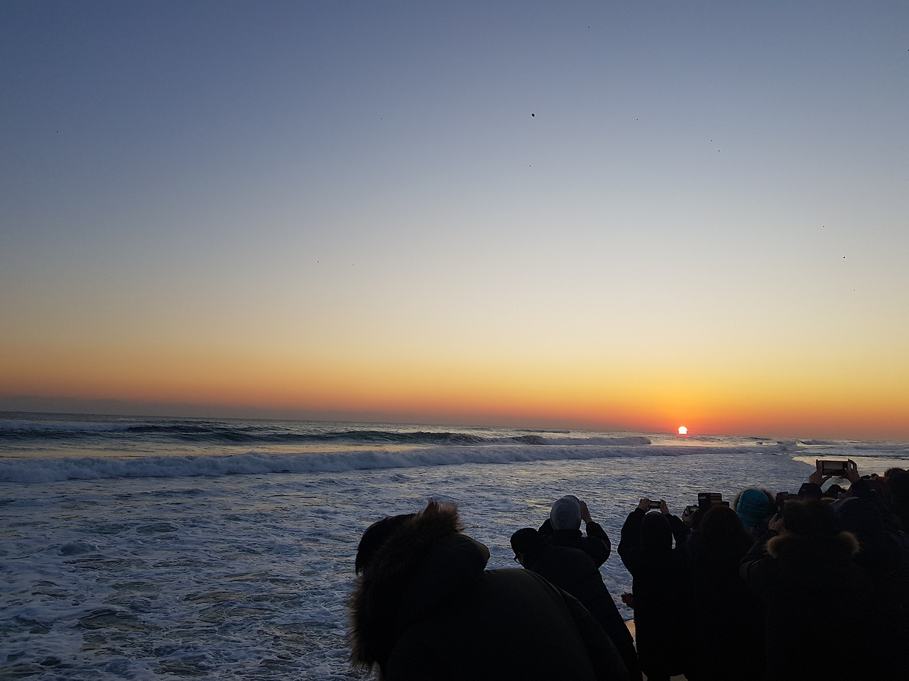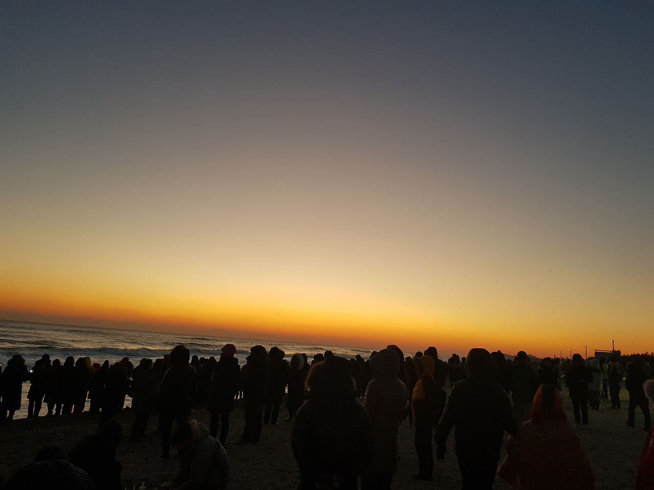 2018년 1월 1일 아침 6시 30분에 알람이 울렸다. 해뜨기 직전 얼어붙을 것만 같은 추위를 예상하고, 꽁꽁 싸맨 채 해변으로 나갔다. 다행히 날씨가 포근해서 얼굴과 손발이 빨갛게 얼어붙는 일은 일어나지 않았다. 바다는 이미 밀려든 사람들로 여름해변을 연상케 했다. 새해 첫날 만난 바다는 힘차게 파도를 몰고 와, 사람들 발 앞에서 넙죽넙죽 인사를 하는 것 같았다. 수평선 너머 해를 기다리며, 사람들도 나란히 수평선 따라 줄을 섰다. 사랑하는 연인들과 가족들이 서로의 어깨를 맞대고 도란도란 이야기를 하며 서있었다. 한쪽에서는 소원 등에 불을 붙여 띄우느라 분주하고, 모래 위에 소원 촛불을 꽂아 놓고 소원을 비는 사람들도 있었다.